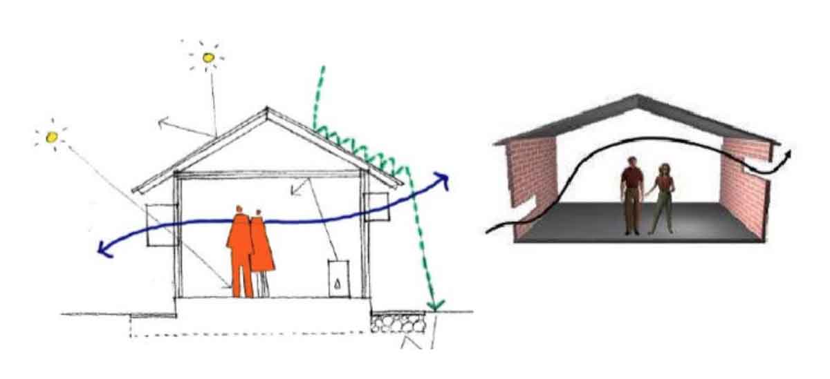 Según estudios científicos, el confort térmico oscila entre los 19°C – 21 C° en invierno y 25 C° en verano, dependiendo también del factor de humedad. La finalidad del sistema de “ventilación cruzada”verifica cuando en el interior del inmueble tenemos una temperatura confortable aunque en el exterior la temperatura sea superior a los 30°C. Este método permite el ingreso de aire fresco y el fácil escape del aire cálido dentro de la vivienda.