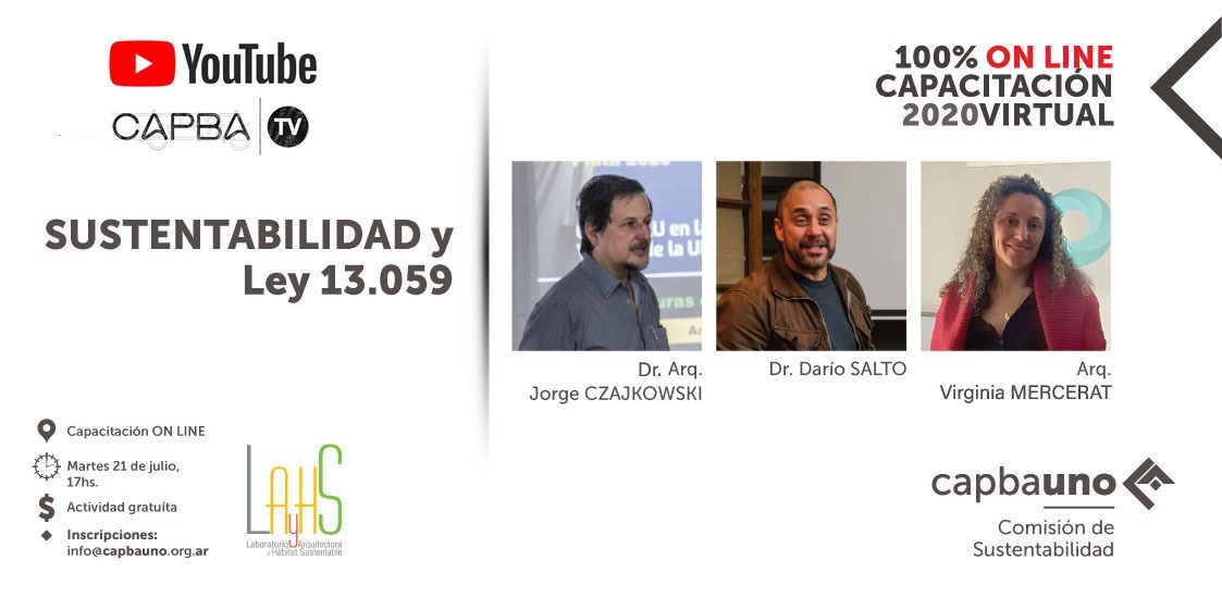 El martes 21/7 a las 17 hs, por la plataforma virtual ZOOM y auspiciada por el CAPBAUNO y el L.A.y H.S., se desarrolló una charla sobre “Eficiencia energética, envolvente edilicia y aplicación ley 13059”.