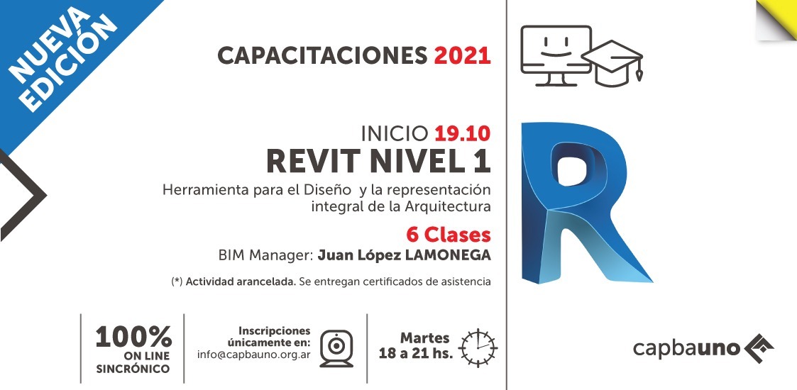 Será dictado en la modalidad virtual por el BIM Manager Juan López Lamonega, los días martes de 18 a 21 hs a partir del 19 de octubre del corriente, con una duración de 6 clases.