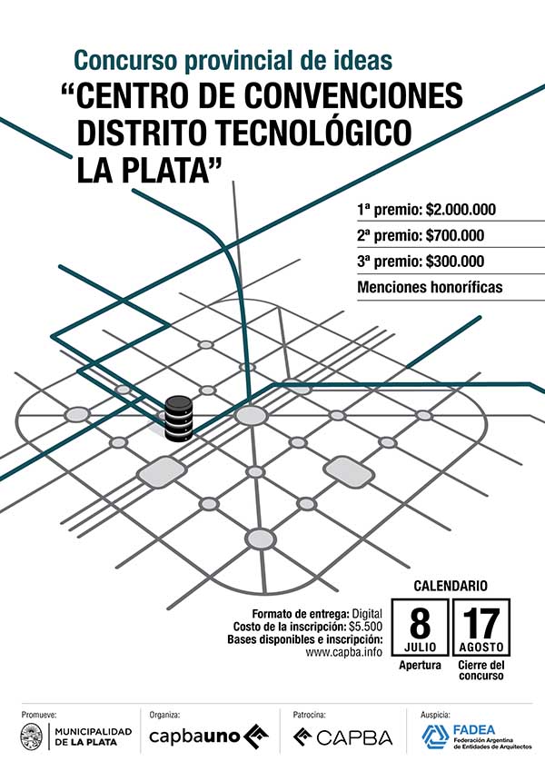 La Municipalidad de La Plata y el Colegio de Arquitectos de la Provincia de Buenos Aires Distrito I, convocan a un CONCURSO PROVINCIAL DE IDEAS PARA EL “CENTRO DE CONVENCIONES DISTRITO TECNOLÓGICO LA PLATA”, a emplazarse en la manzana comprendida por la calle 20, calle 50, calle 21 y calle