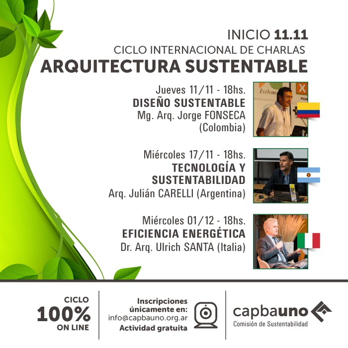 En los meses de noviembre y diciembre, organizado por la Comisión de sustentabilidad del CAPBAUNO, se desarrollará un ciclo virtual de charlas de Arquitectura Sustentable, con invitados internacionales.