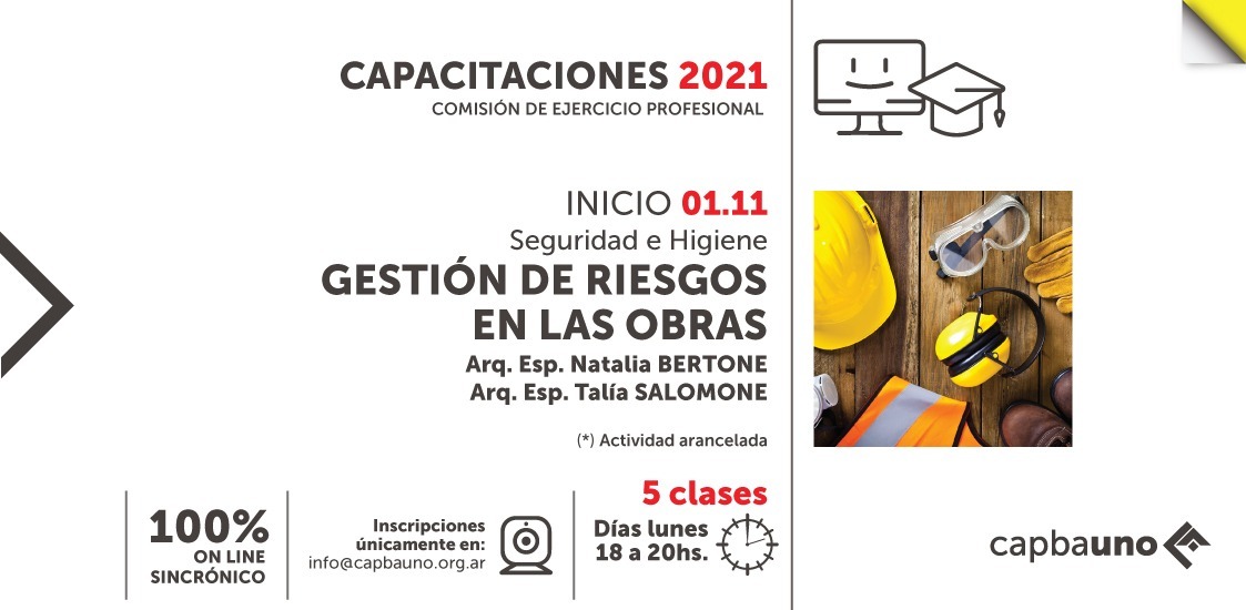 El lunes 1 de noviembre comienza el curso “Gestión de Riesgo en las Obras”, a cargo de Natalia BERTONE y Talia SALOMONE, Arqs. Especialistas en Higiene y Seguridad en la Industria de la Construcción FAU – UNLP.