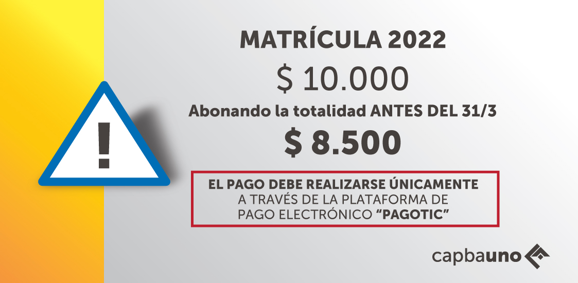Recordamos que el Consejo Superior del CAPBA estableció un monto de $10.000 (diez mil pesos) para la matrícula anual correspondiente al año 2022 y $8.500 (ocho mil quinientos pesos) abonando la misma en un pago antes del 31 de marzo del corriente.