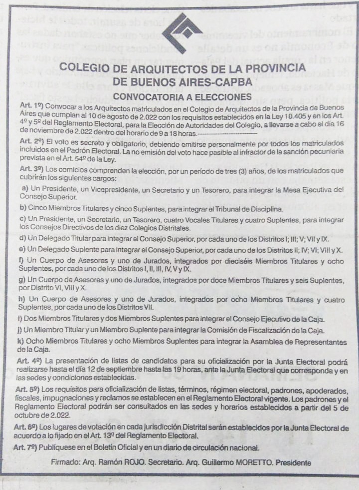 Atento a que el 10 de diciembre de 2022 concluye el mandato de 3 años de las actuales autoridades del Colegio y en acuerdo a los plazos, términos, modalidades y procedimientos que regulan el Acto Electoral dispuestos en la Ley 10.405, el Consejo Superior del CAPBA promovió la convocatoria a elección de autoridades para el Período 2022-2025 a través de la Resolución 72-22. (VER)