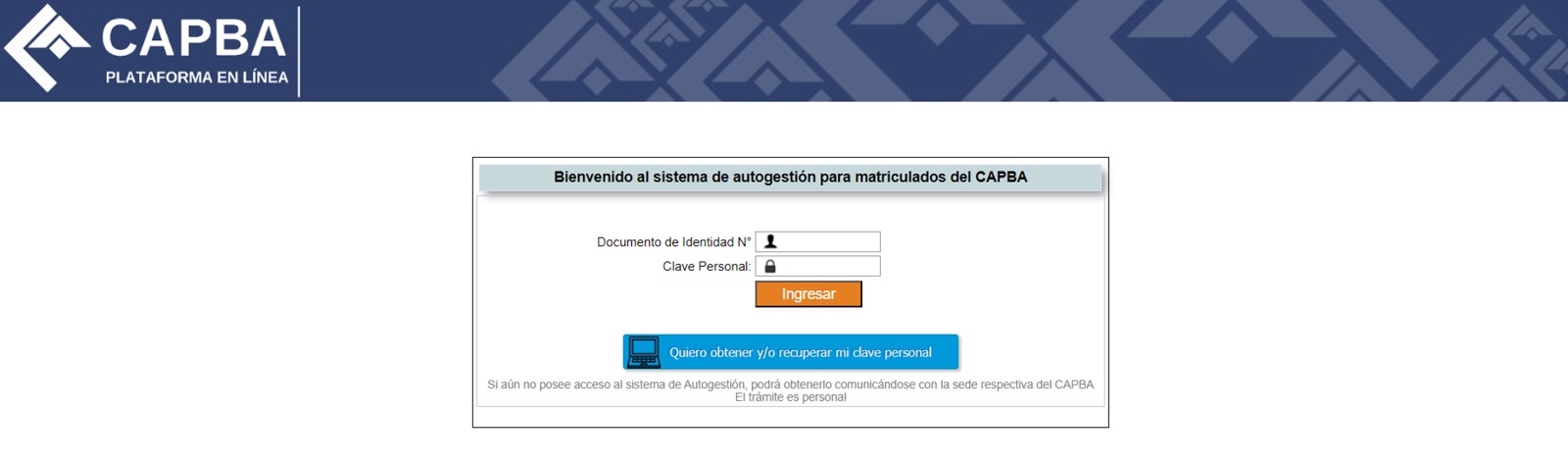 Deberá accederse al sitio enlínea.capba.org.ar en la opción de “autogestión para matriculados”, donde el interesado deberá colocar su DNI y luego indicar “quiero obtener y/o recuperar mi clave personal”, iniciando así el proceso de generación de su contraseña.