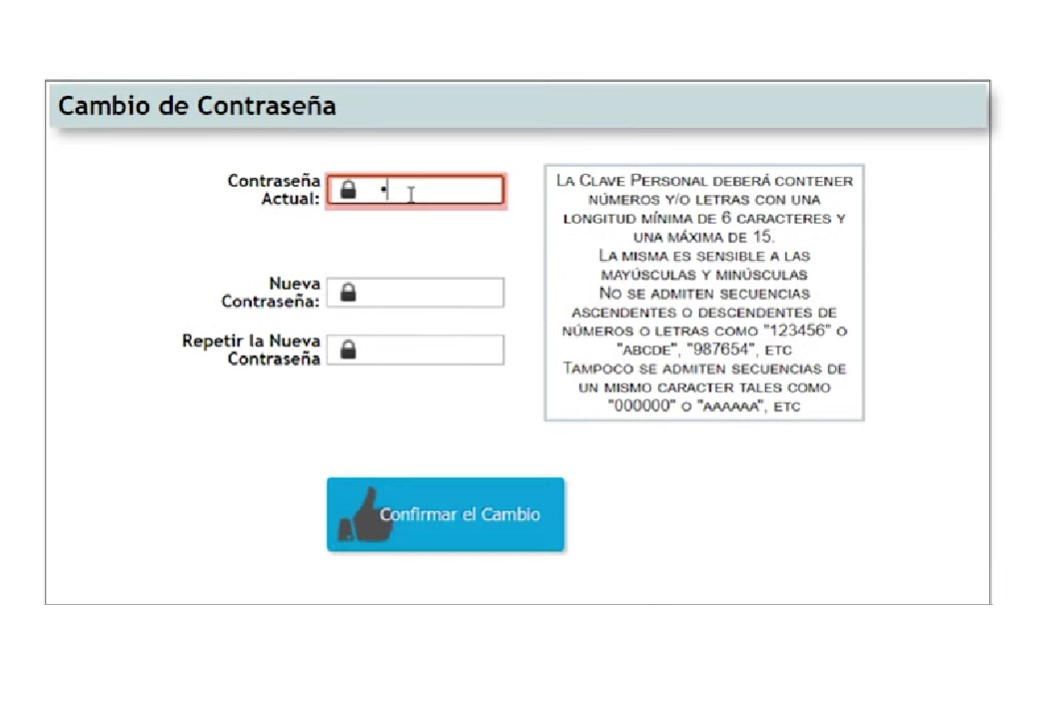 Allí deberá ingresarse la contraseña actual, para seguidamente ingresar y repetir la nueva contraseña.