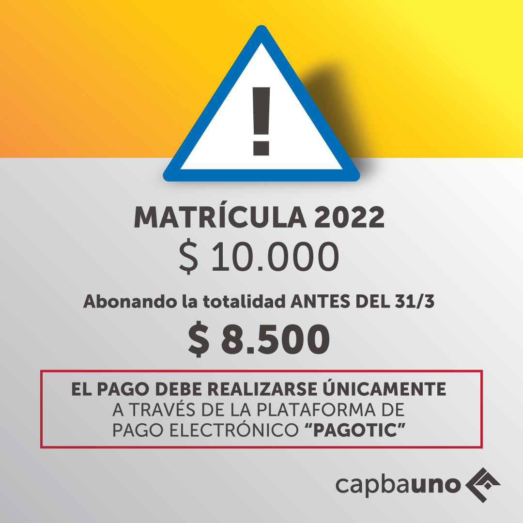 Recordamos que el Consejo Superior del CAPBA estableció un monto de $10.000 (diez mil) para la matricula anual correspondiente al año 2022 y $8.500 (ocho mil quinientos) abonando la misma en un pago antes del 31 de marzo del corriente.