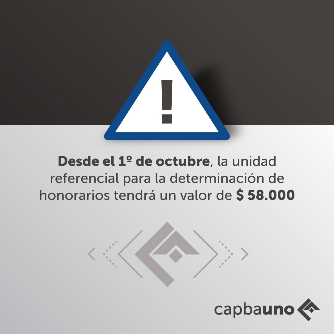 Desde el 1 de octubre está vigente el nuevo valor de la UNIDAD REFERENCIAL para la determinación de honorarios mínimos, los aportes previsionales y la CEP, que quedó establecido por Resolución 63/21 del Consejo Superior del CAPBA en $ 58.000.- (cincuenta y ocho mil pesos), conforme a lo acordado entre